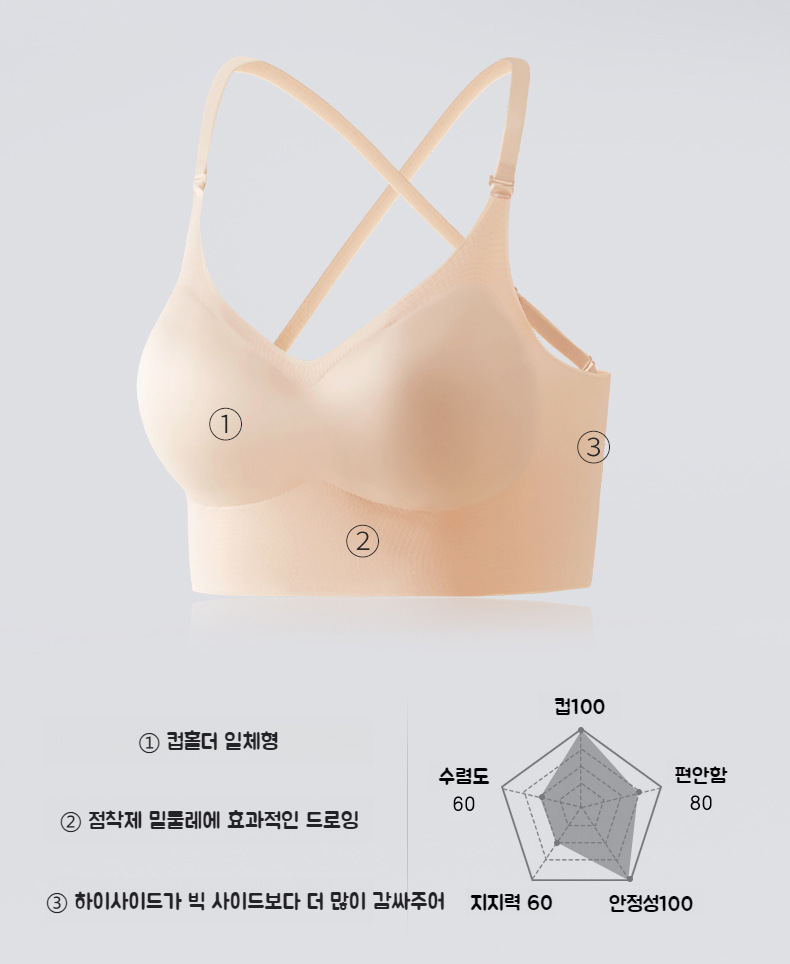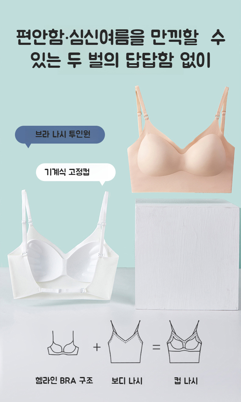 올인원 헴팬티와 컵 브라 일체형, 노와이어로 편안함 제공, 볼륨 업 효과, U넥과 백 브라 디자인, 데일리 이너웨어로 적합