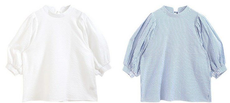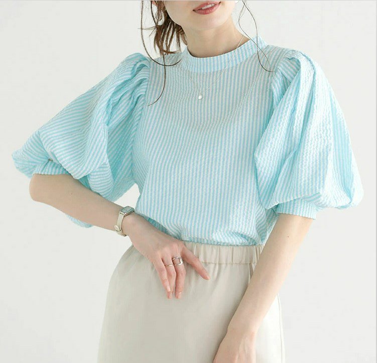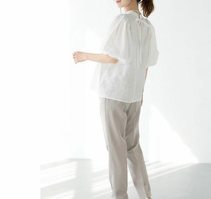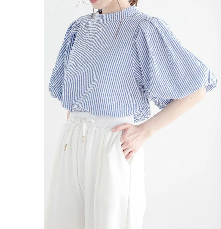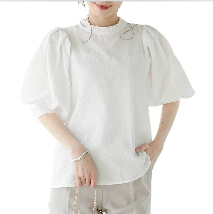 프렌치 칼라 퍼프 반소매, 우아한 프렌치 디자인, 퍼프 소매로 여성스러운 실루엣 연출, 가볍고 편안한 착용감 제공